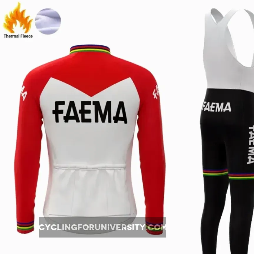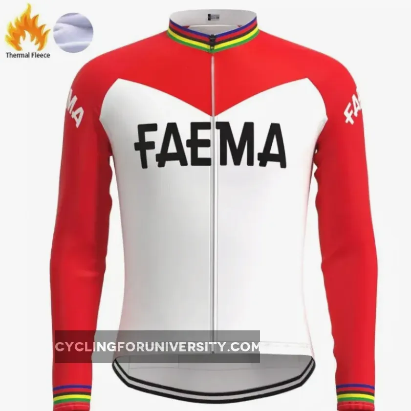 Dedicated to those who ride a bicycle during winter time. You will stand out with this superb vintage FAEMA team long sleeve cycling set with thermal fleece. FAEMA was a major cycling team during the 50's and 60''s winning the Tour de France 69 with belgium champion Eddy Merckx.