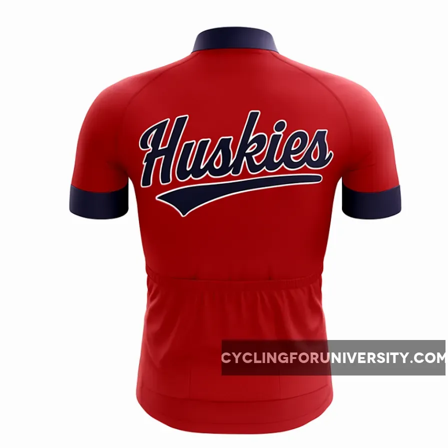 Howl with team spirit in this Huskies cycling jersey, boasting bold navy Huskies script on a vivid red base with navy collar trim for a classic athletic edge. Lightweight and aerodynamic, this bike top suits road cycling, snowy trail spins, and fan group rides—perfect for UConn supporters or dog lovers bringing husky power and university loyalty to their high-performance cycling kit.
